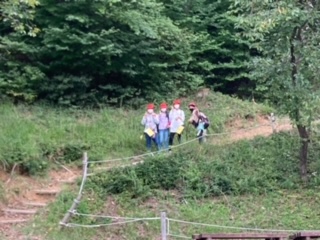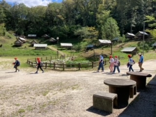 空は晴れ、日がさしてきました。子どもたちは、元気に山の中を歩いています。