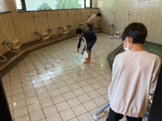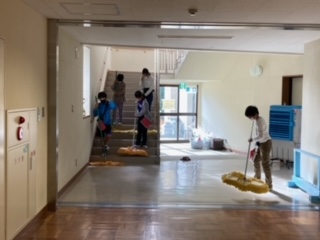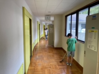 野外センターの部屋や廊下、階段、トイレなどを清掃しました。来た時よりも美しく。