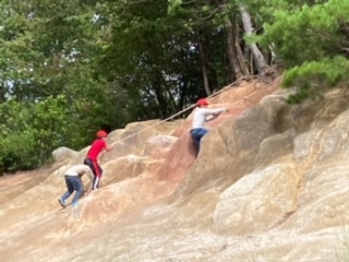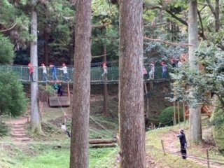 フィールドアスレチック実施中。写真は、Bエリア。ロープウェイやつり橋、暗やみトンネルなどがあります。