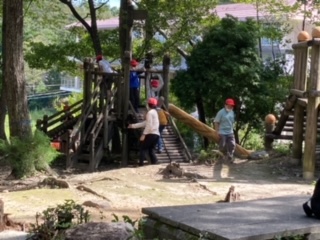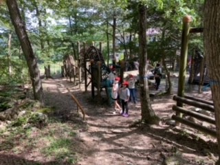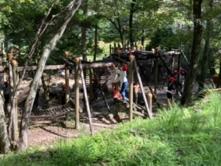 フィールドアスレチック実施中。写真は、Aエリアの様子です。学校にはない施設がいっぱいです。
