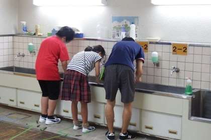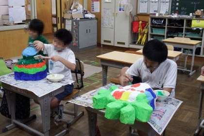 お面作りが進んでいます。色付けまで終わったお面が、廊下側にたくさん並べられています。この日はニス塗りに入りました。ニスの塗りの残しがないように、丁寧に仕上げました。