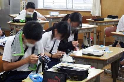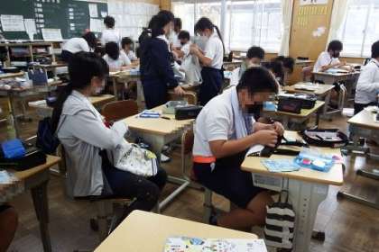 家庭科で自分でつくった手さげ袋へのボタンの縫い付けを進めました。ボタンを力の加わる所です。糸がほどけないように、ボタンの縫い付け位置に気を付けながら活動を行いました。