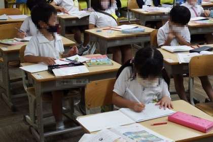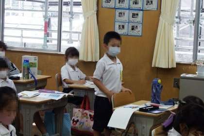 「はじめに5ひきのっています」「つぎに2ひきおりました」「そのつぎに4ひきのってきました」算数「3つのかずのけいさん」で、減って増える計算の学習を行いました。