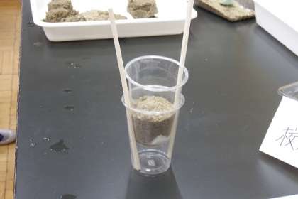 理科「雨水のゆくえ」で、実験を行いました。校庭の土と砂場の砂、つぶの大きさと水のしみこみ方との関係を調べました。砂に水たまりができない理由が分かりました。