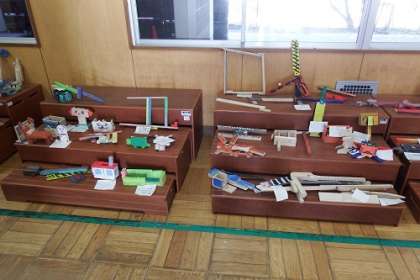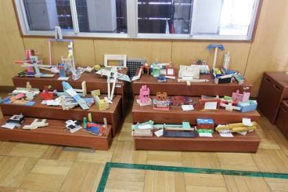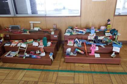 図工「ギコギコトントンクリエーター」の作品が完成し、下駄箱付近に展示しました。色付けされた作品はとてもきれいです。初めてのこぎりやかなづちを使った子も多く、思いのこもった作品になりました。