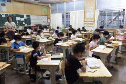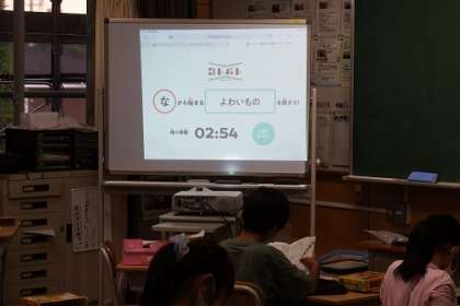 国語では国語辞典を使います。この日は、国語辞典をスムーズに使い問題にチャレンジしました。「なからはじまる よわいもの」子どもたちは頭をひねりながら面白そうに学習に取り組んでいました。