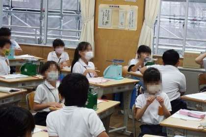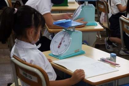 算数「重さ」の学習に入りました。この日は、はかりを使って、教科書など身の回りの物の重さをはかります。平らなところに置くこと。最初は針が0を指していること。正面から目盛りを読むことなどを確認しました。