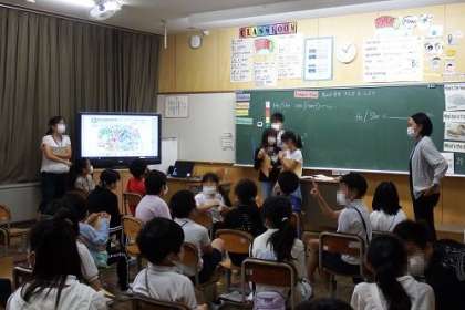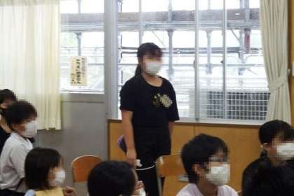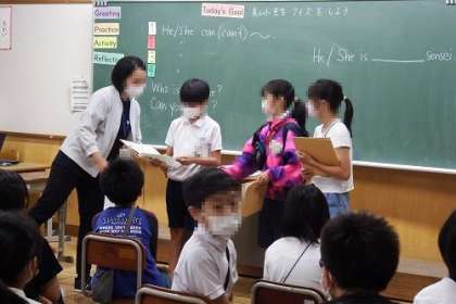 英語で「美山小学校の先生を紹介するクイズをしよう」の取り組みを行っています。子どもたちは、クイズのためのインタビューを終えました。この日は、クイズを出題しみんなに当ててもらっていました。