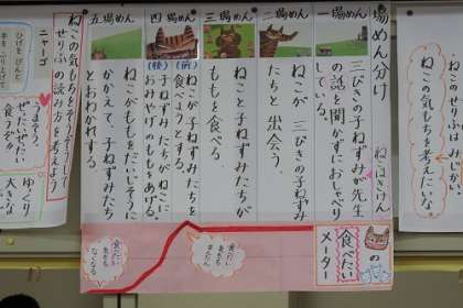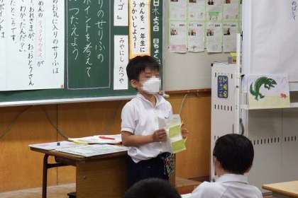 2年生が国語の研究授業を行いました。単元は「ニャーゴ」です。1年生にお話を紹介することを最終目的に、どのようにニャーゴをんだら相手に伝わるのか。そのために登場人物の心情の読み取りを深めました。子どもたちが自信いっぱいに笑顔で音読していたことがとても印象的でした。子どもたちの下校後、全職員で授業検討会を行いました。