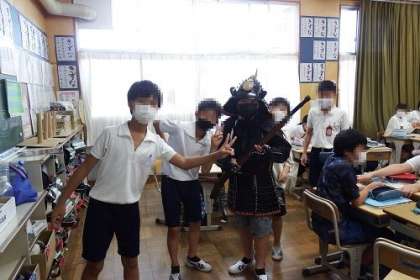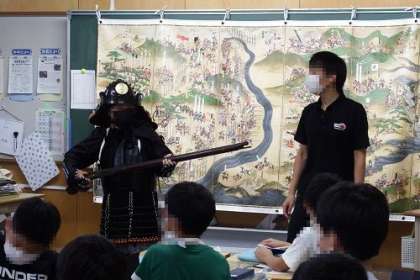 豊田市郷土資料館の方をお招きし、社会科の出前授業を行いました。内容を、長篠の合戦です。長篠の合戦図を使い、火縄銃や鎧兜を実際に触りながら、当時の合戦の様子をとらえました。