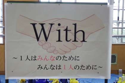 3年生の広場の掲示板に、今年の学年スローガンが掲示されています。「With」一人はみんなのために、みんなは一人のために