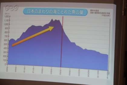 社会科の学習で、日本の周りでとれた魚の量の変化について考えました。グラフでは、1990年からとれる魚の量が急に減ってきています。この時期に、何が起こったのでしょう?
