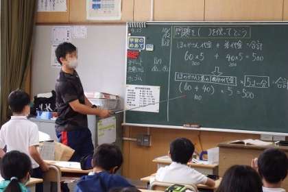 算数「式と計算の順じょ」の学習に取り組んでいます。この日は、計算のきまりについて考えました。(60+40)×5=60×5+40×5 となることから、( )を使った式にはきまりがあることを知りました。