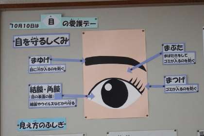 保健室掲示板が更新されました。今月は、目の特集です。10月10日の目の愛護デーにちなんで作成しました。読書の秋、学習の秋。目をたくさん使う時期です。大切にしたいですね。