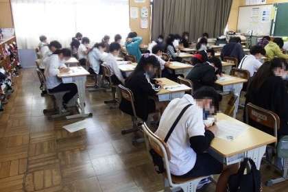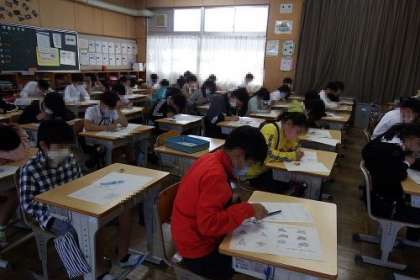 写真は、5年生月例テストの様子です。学習の定着を図ること、自分の定着度を確認すること、子どもたちが集中して取り組んでいます。