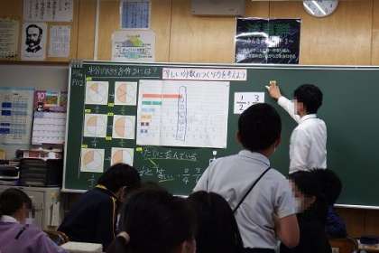 算数「分数」の学習を行っています。この日は、2分の1に等しい分数について調べました。分母と分子に同じ数をかけても、同じ数でわっても、分数の大きさは変わらないことが分かりました。