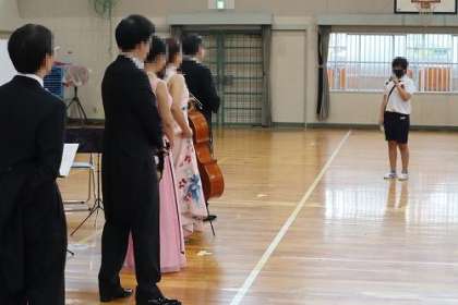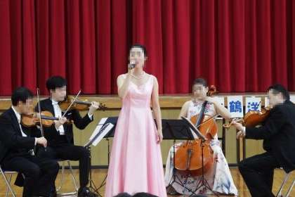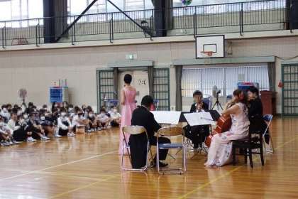 本年度の美山音楽会を6年生の参加のもと実施しました。吉鶴様をはじめ、5名の演奏家の方々にお越しいただき、弦楽器や歌唱で、本物の音に触れることができました。オペラ座の怪人やサウンドオブミュージックなど、子どもたちにとって聞いたことがある曲もあり、一生懸命に聴くことができました。