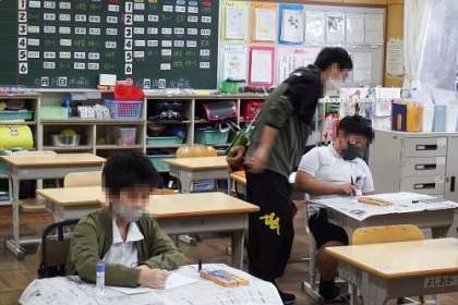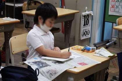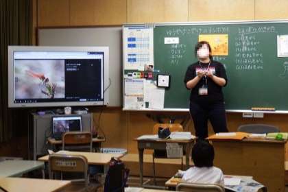 秋です。図工「ゆうやけ こやけの トンボたち」で、トンボを描きました。トンボの画像を参考に、羽は何枚?足はいくつ?体は?よく見ながら、秋を描きます。