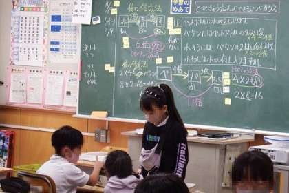 算数「何倍でしょう」の学習です。今日の問題は、「ペットボトルには水が2Lはいります。バケツにはペットボトルの4はい分、水そうにはバケツの2はい分はいります。水そうには、水が何Lはいりますか」というものです。さて、答えは・・・。