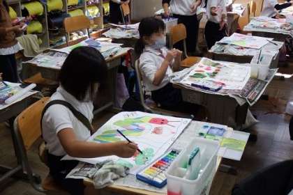 読書感想画「はらぺこ あおむし」の完成が近づいてきました。はらぺこあおむしを画用紙に張り付けた後、バックを絵の具を使って塗り始めています。あおむしが画面から飛び出してきそうです。