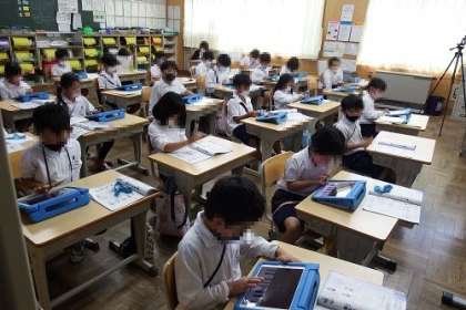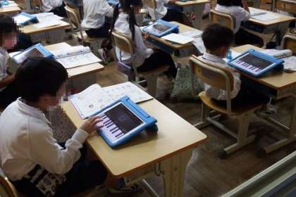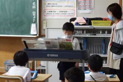 音楽の学習で、タブレットを使いました。「ドレミ」「ドミソ」など、3つの音が連なる音遊びを行いました。自分が作った音をみんなに発表です。