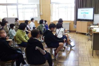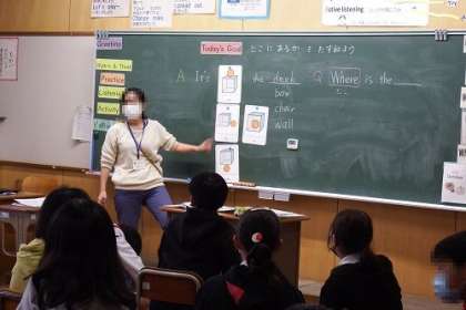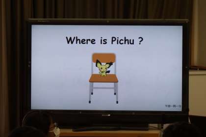 英語で「どこにあるのか尋ねる」学習に取り組みました。on,by,in,underなどの単語を使い、物のある場所を表現します。