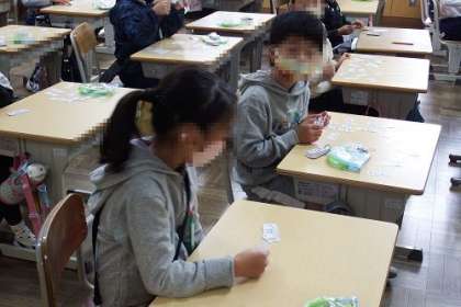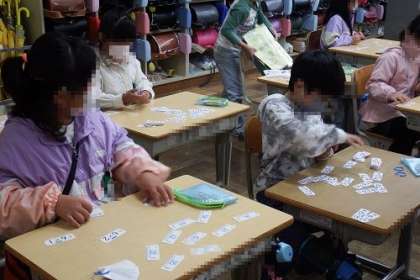 算数「かけ算」の学習が進んでいます。写真は、7の段の学習の様子です。計算カードでお互いに問題を出し合いながら、慣らしていきます。自信が出てきたようです。