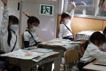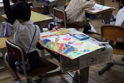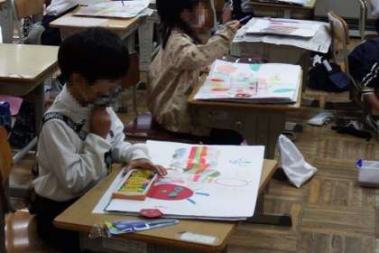 図工で取り組んでいる読書感想画「はらぺこ あおむし」。中心となるあおむしを描くことができたので、この日は、背景の食べ物や空、土、葉に色をつけていきました。完成も間近です。