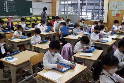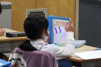 国語「かたかなをかこう」で、かたかなで書く言葉を学習しました。写真は、タブレットを使って、かたかななどの練習をしているところです。