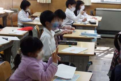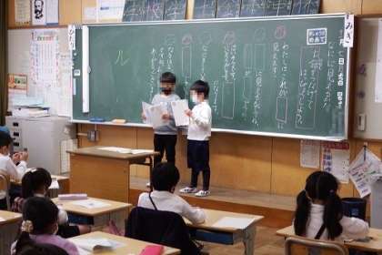 国語「なにに見えるかな」の授業の様子です。この単元では、話を楽しくつなぐことを学習します。つなぐ言葉を集めて、相手との会話を楽しみます。写真は、発表の様子です。