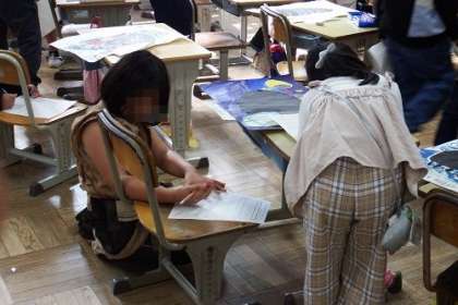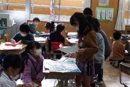 図工で取り組んでいる読書感想画「だんごむし そらをとぶ」の作品が完成し、みんなで鑑賞を行いました。友達の作品のよいところをたくさん見つけることができたようです。