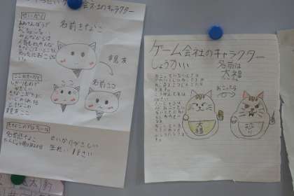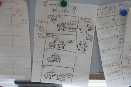 写真は、3年生会社活動の広場に置かれた掲示板です。各会社のキャラクターを作りました。会社からの連絡や4コマ漫画も。子どもたちの創意あふれる取り組みが続きます。