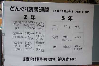 現在、2年生と5年生は、どんぐり読書週間中です。たくさんの本を読んで、自分の好きな本を見つけてください。図書館は、みなさんを待っています。