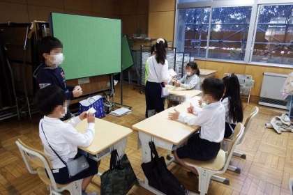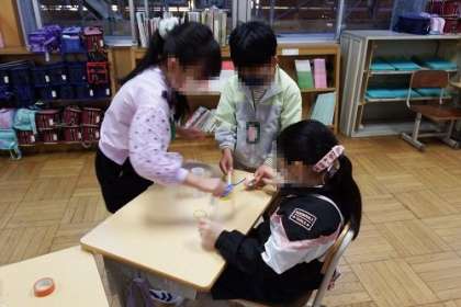 2年生が1年生を招待し、おもちゃ教室を行いました。教室や広場で、2年生が準備したおもちゃを1年生と一緒に作ります。1年生の子が作りやすいように、説明を工夫したり、作るのを手伝ってあげたり、2年生の素敵な姿がたくさん見られました。