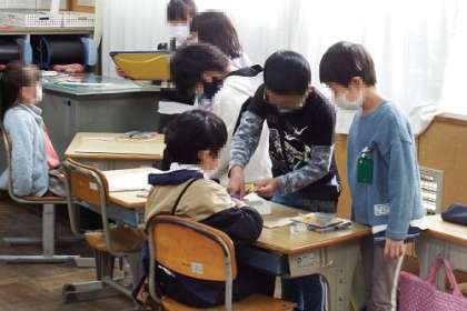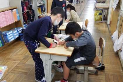 2年生が1年生を招待し、おもちゃ教室を行いました。教室や広場で、2年生が準備したおもちゃを1年生と一緒に作ります。1年生の子が作りやすいように、説明を工夫したり、作るのを手伝ってあげたり、2年生の素敵な姿がたくさん見られました。