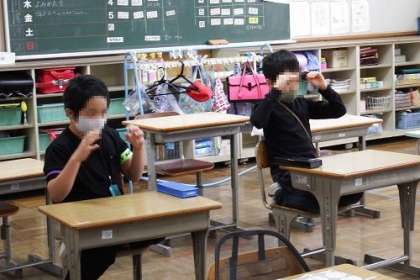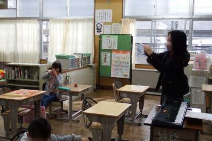 写真は、「どんぐりころころ」を学習している様子です。歌を歌いながら、身体表現を加えていきます。戸惑いながらも笑顔いっぱいに取り組んでいました。。