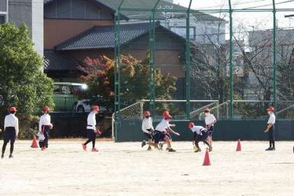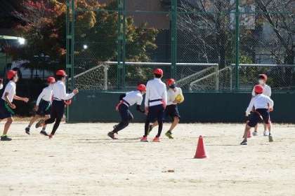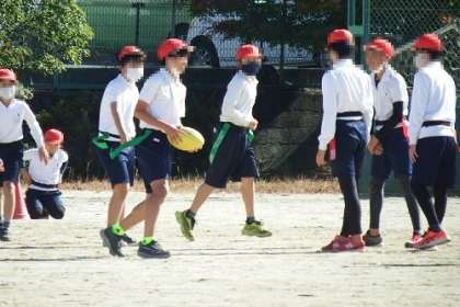 体育でタグラグビーを行いました。ラグビーはタックルがありますが、タグラグビーにはありません。その代わりに体につけた相手のタグを引っ張ります。元気な声が、運動場に広がりました。