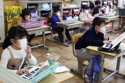 音楽で「山のポルカ」の練習をしました。タブレットで指の動かし方を確認しながら、ピアニカの練習を繰り返しました。視覚化された映像は、子どもたちにとってとても分かりやすいです。