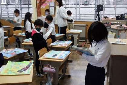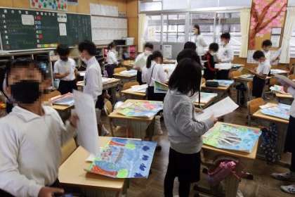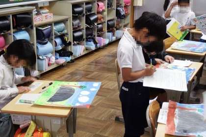 読書感想画「だんごむし そらをとぶ」の作品が完成し、鑑賞会を行いました。自分が工夫したところや友達の作品を見て、いいなと思ったところなどを、プリントに書き込みました。