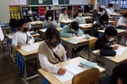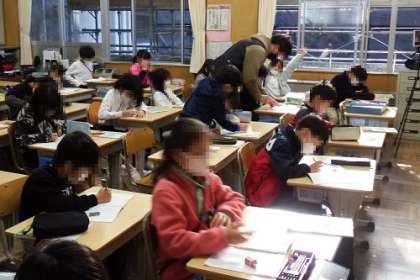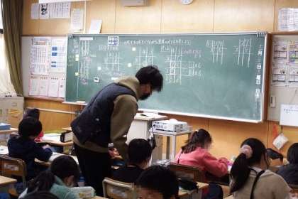 算数「1けたをかけるかけ算の筆算」の学習に取り組んでいます。この日は、一の位と十の位に繰り上がりがある筆算の仕方を学習しました。数字のたてをそろえることが、大切です。