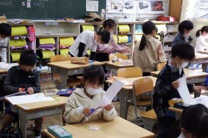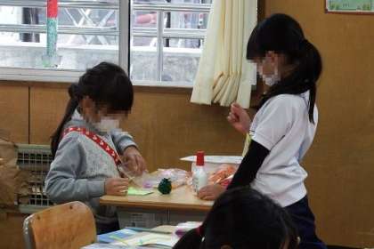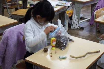 集めた木の実や葉っぱを使って、おもちゃ作りを行っています。袋いっぱい入ったドングリを選びながら作っている子も。季節を感じながら、楽しい時間を過ごしています。