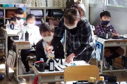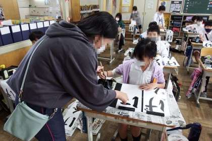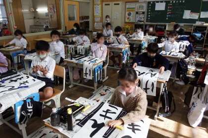 講師の先生をお招きし、書初めの学習を始めました。3年生は、毛筆で行う書初めは今年初めてです。お話をよく聞きながら、集中して取り組むことができていました。