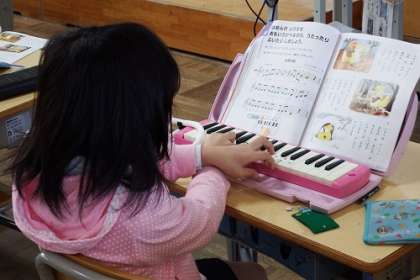 音楽の学習で「こぎつね」に取り組みました。こぎつねのかわいい世界をイメージしながら、ピアニカにも挑戦です。