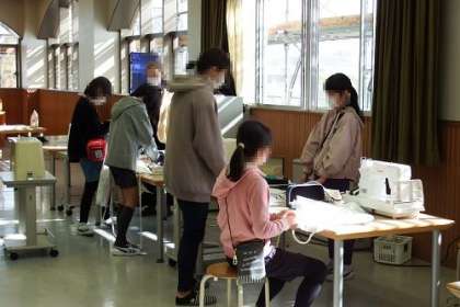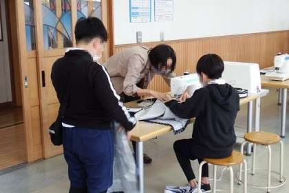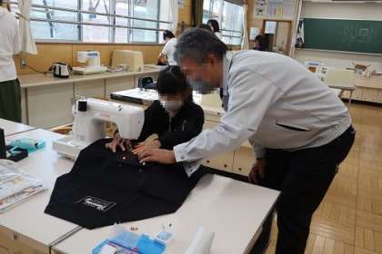 5年生のエプロンづくりが進んでいます。少しずつ完成に近づいていくエプロン。自分で着けて料理を作っている姿を思い浮かべながら。