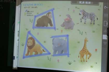 算数「三角形と四角形」の学習の様子です。この日は、前回つくった動物の家をなかま分けすることで、三角形と四角形の定義を学習しました。