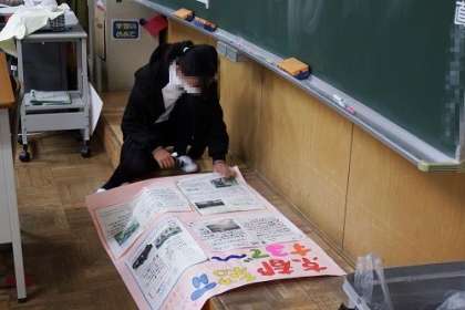 修学旅行のまとめをグループごとに行いました。分担された内容を、写真などの資料を使いながら紹介してあります。カットや構成なども見やすくなるように工夫しました。