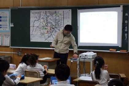 生活科で学区探検に出かけます。写真は、事前学習の様子です。美山小学校の学区には、どんな建物や公園などがなるのかな。自分たちの町を知るよい機会にしたいです。