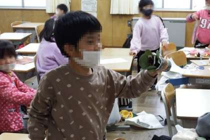 生活科で、木の実や葉っぱをつかったおもちゃを作成しています。次々の完成するおもちゃ。子どもたちはどんなおもちゃなのか、生き生きと説明してくれます。