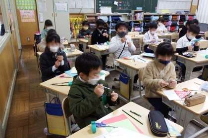 2年生は、図工で「パタパタストロー」を作成しています。写真は、ストローの仕組みを完成させ、これから飾りつけに入るところの様子です。ストローをパタパタ動かしながら楽しんでいます。