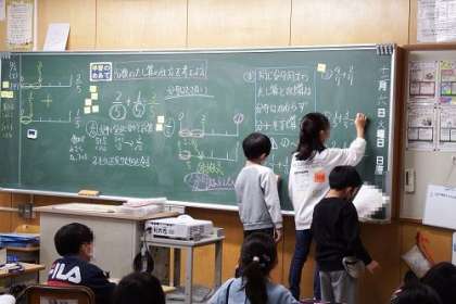 算数で「分数のたし算」の仕方を考えました。分母が同じ分数は、分子同士を足せばよいことに気付きました。これからひき算にも挑戦します。